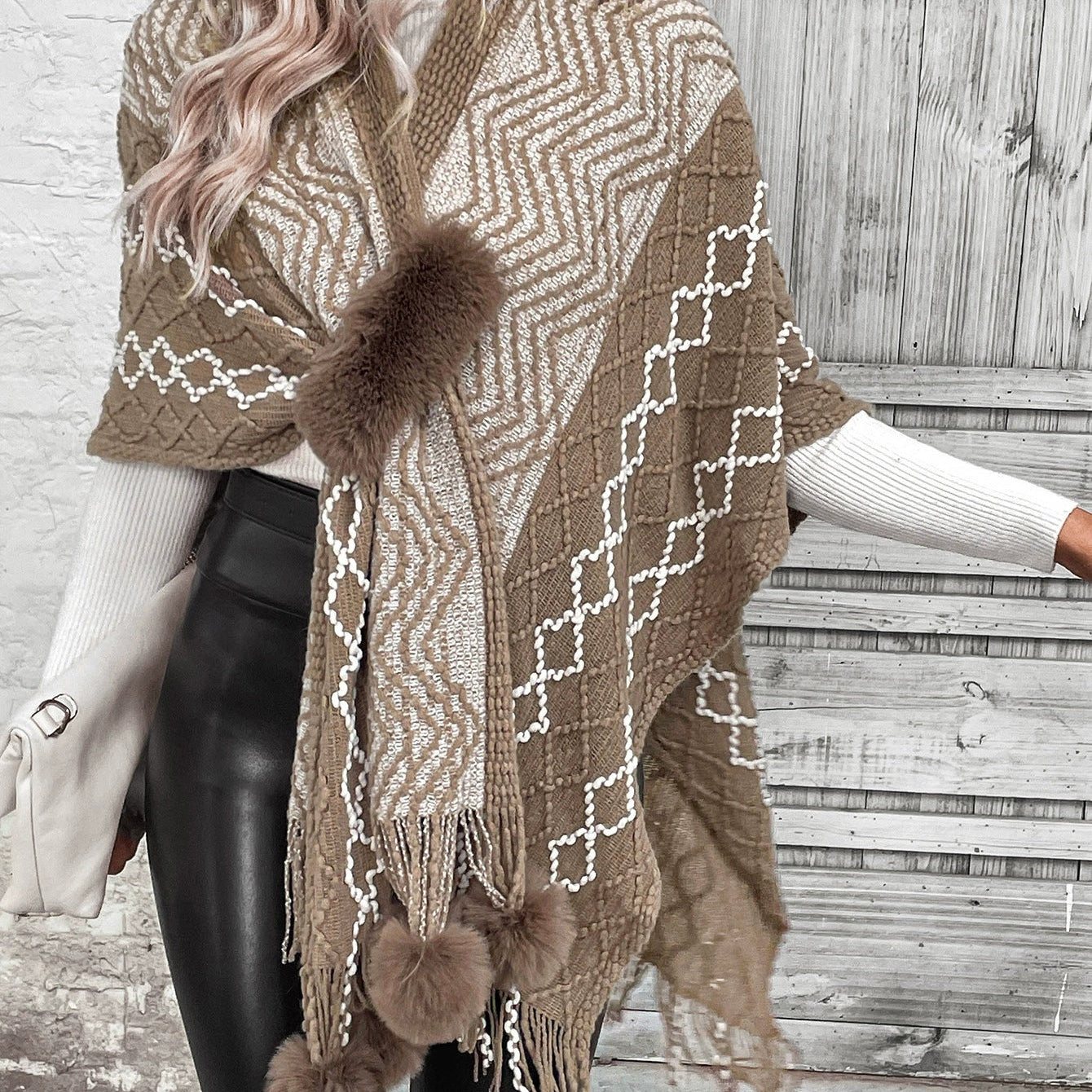 Women’s Cape Shawl Cardigan – Wool Knit – Oversized Fit – Fringe Hem – V-Neck Boho Style