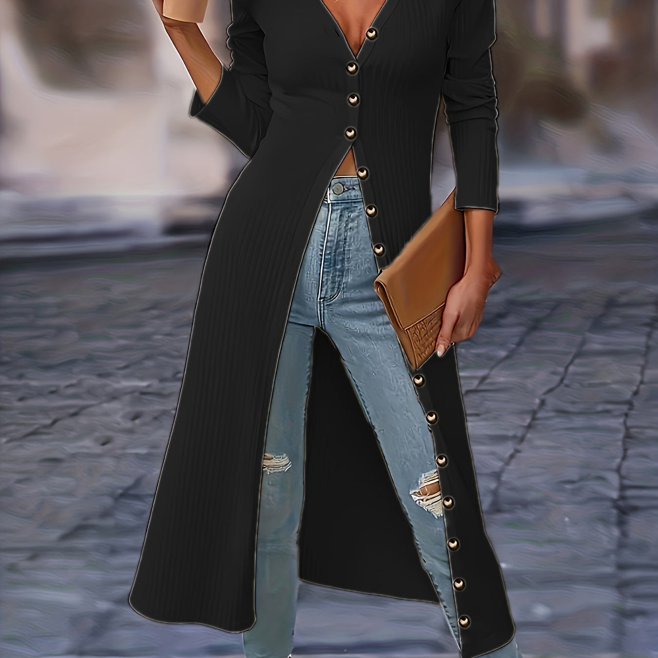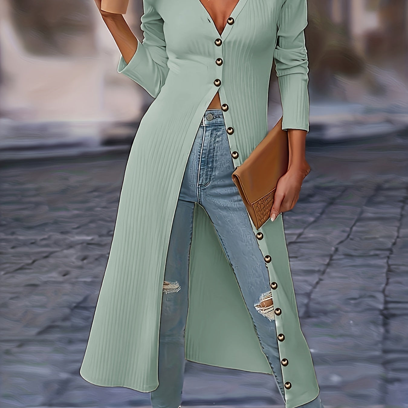 Women's Long Cardigan - Button Front V-Neck - Fitted Knit - Knee Length Layering Piece