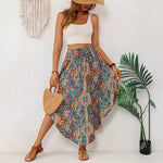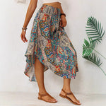 Women’s Long Skirt – Flowing A-Line – Exotic Print – Drawstring Waist – Asymmetric Hem