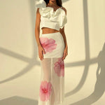 Discover the Sheer Floral Mesh Mermaid Skirt by Couture-Moda. This ankle-length, form-fitting skirt flares elegantly at the hem, crafted with breathable mesh featuring a delicate floral print. Perfect for evening events and garden parties, it combines comfort and sophistication, creating a stunning silhouette.