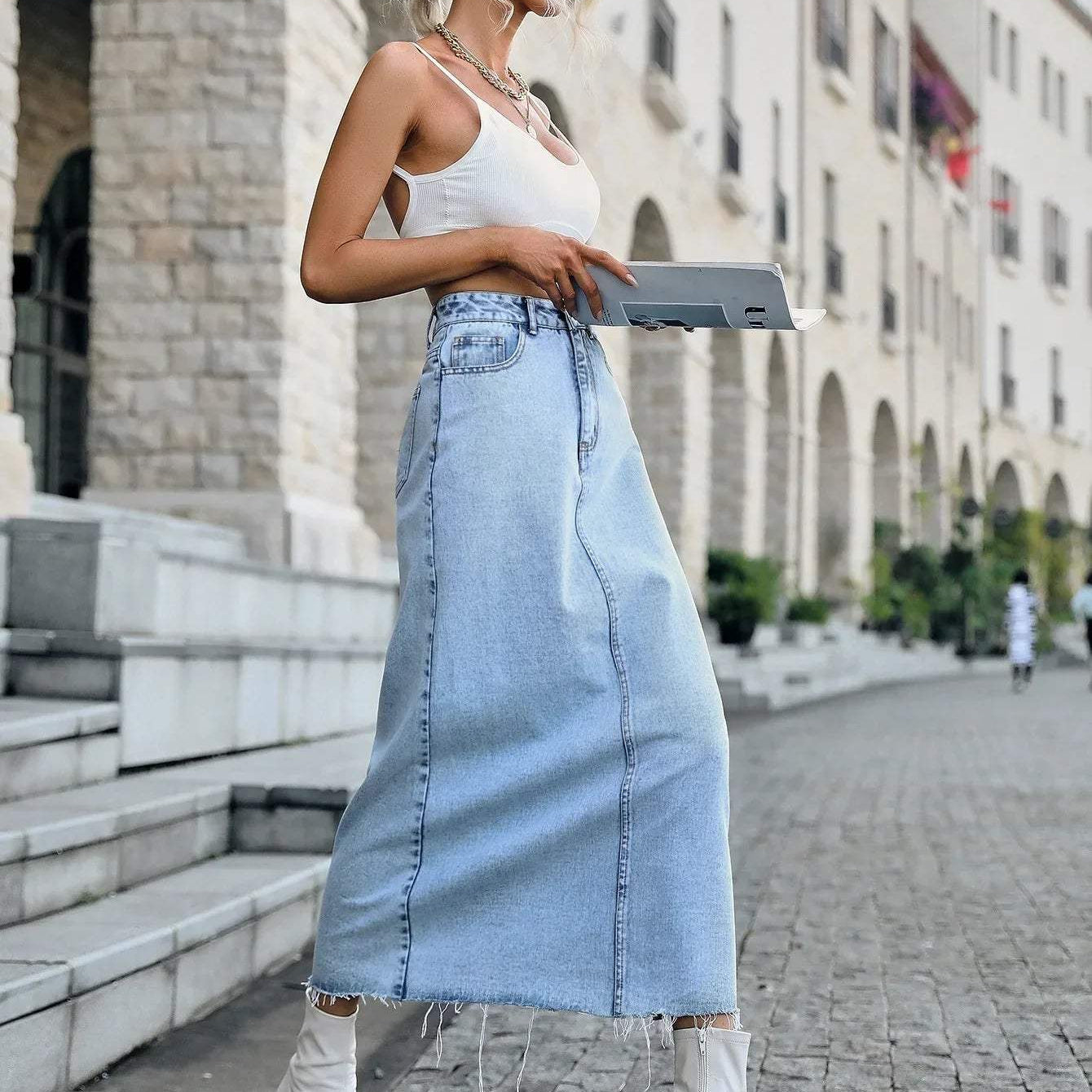 Women's Denim Maxi Skirt - High Waist - Front Seam - Frayed Hem Casual Wear