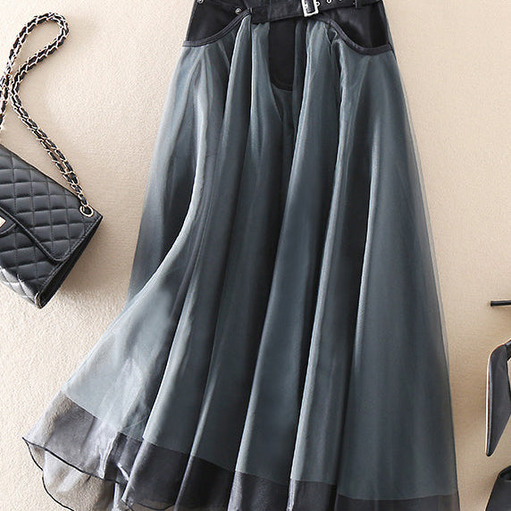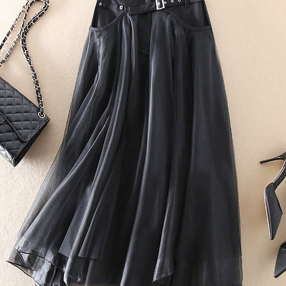 Elegant Pleated Mesh Midi Skirt for Women with Ruffle Detail