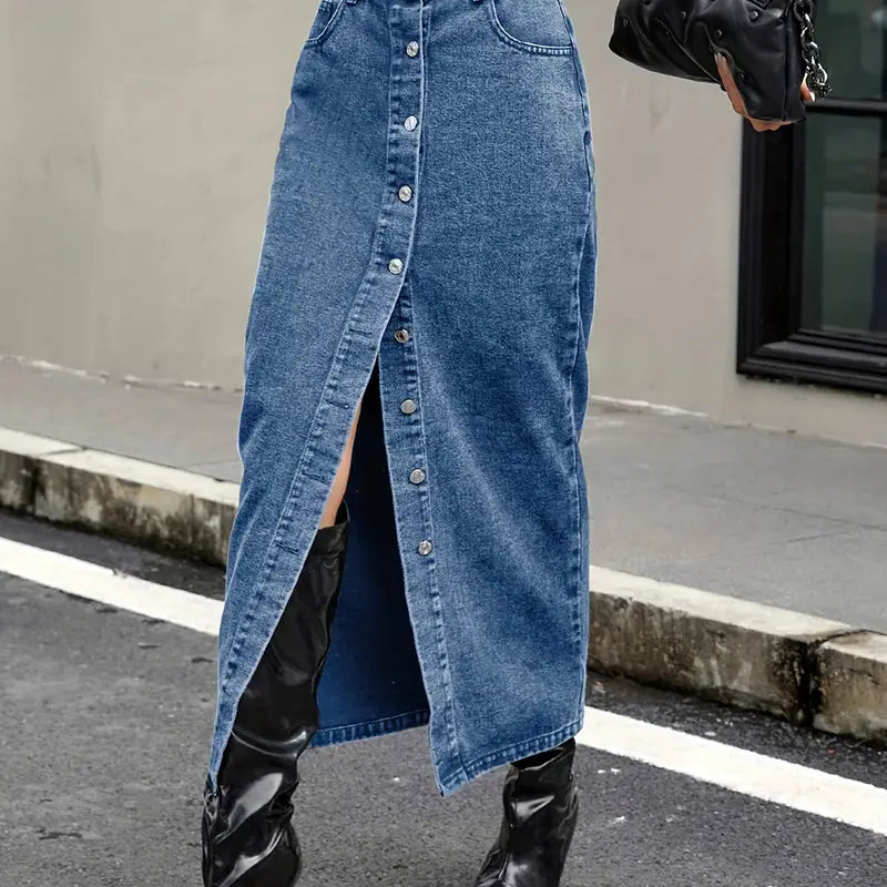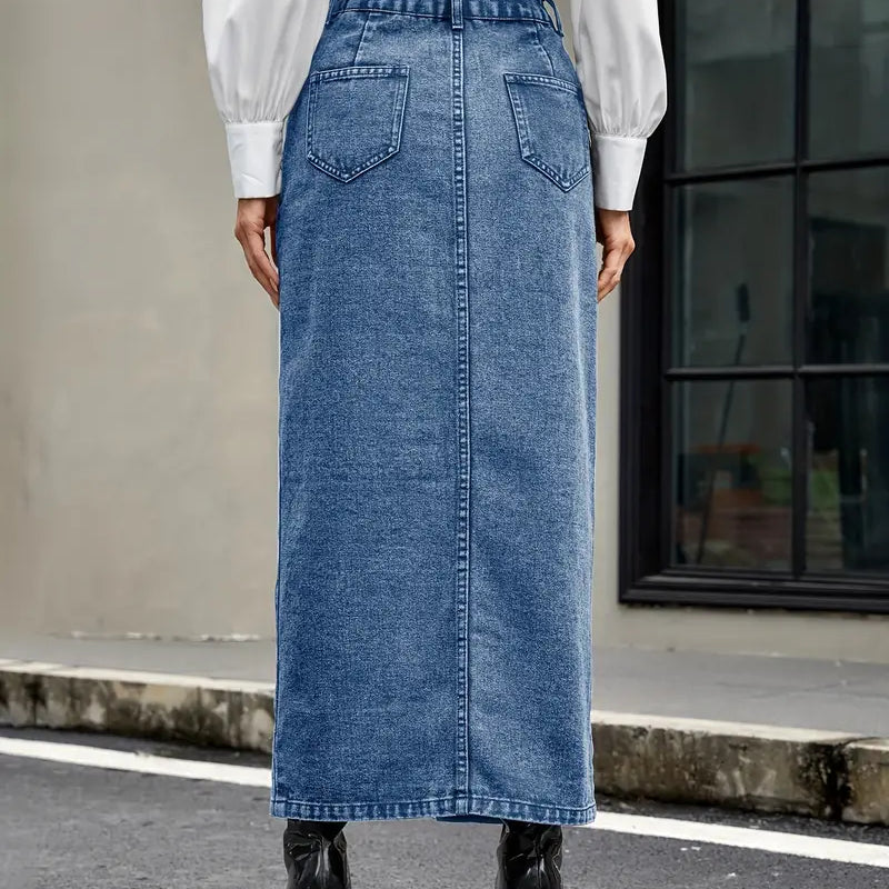 Women's Denim Skirt - High Waist Midi - Front Slit - Classic Casual Fit
