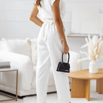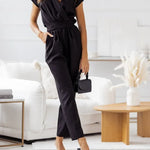 Women's Jumpsuit - Wrap V-Neck - Short Sleeve - Belted Waist - Tailored Fit