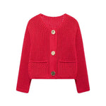 Elevate your wardrobe with this chic mesh-knit cardigan, designed to add a trendy touch to your outfits. Its breathable knit fabric ensures comfort while the stylish gold-tone buttons and functional front pockets add a sophisticated flair. Perfect for layering during transitional seasons, this cardigan pairs effortlessly with casual or dressy ensembles. A must-have staple for women looking to blend comfort and elegance this spring and autumn!