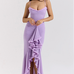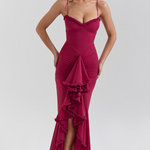 Ένα εντυπωσιακό και θηλυκό φόρεμα με εφαρμοστή γραμμή που αγκαλιάζει το σώμα και αναδεικνύει τη σιλουέτα. Οι λεπτομέρειες με βολάν στο ντεκολτέ και στη φούστα χαρίζουν αέρα ρομαντισμού και κομψότητας. Ιδανικό για βραδινές εξόδους και ιδιαίτερες περιστάσεις όπου θέλετε να ξεχωρίσετε.