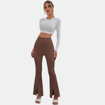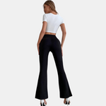 Women's High-Waisted Flare Trousers - Slim Fit - Stretch Fabric - Front Slit Hem are a must-have! These tailored trousers offer a flattering, slim fit with a stylish flare and front slit detail. The stretch fabric ensures comfort and flexibility, making them perfect for day or night.