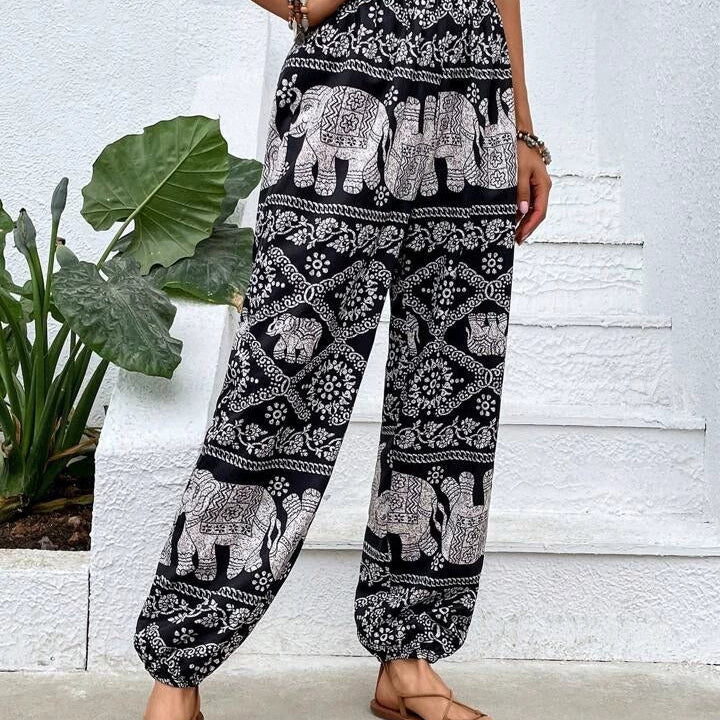 Women's Harem Trousers - Bohemian Elephant Print - Loose Fit - Elastic Waist & Cuffs
