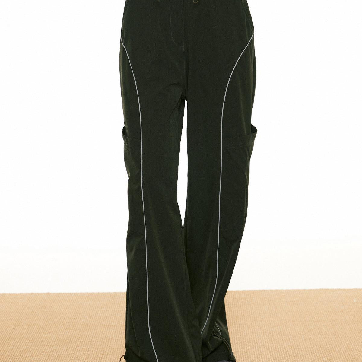 Women's Cargo Trousers - Wide Leg - Drawstring Waist - Contrast Piping - Utility Style