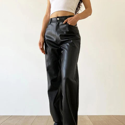 Women's Faux Leather Trousers - High Waisted - Wide Leg - Chic & Modern Fit