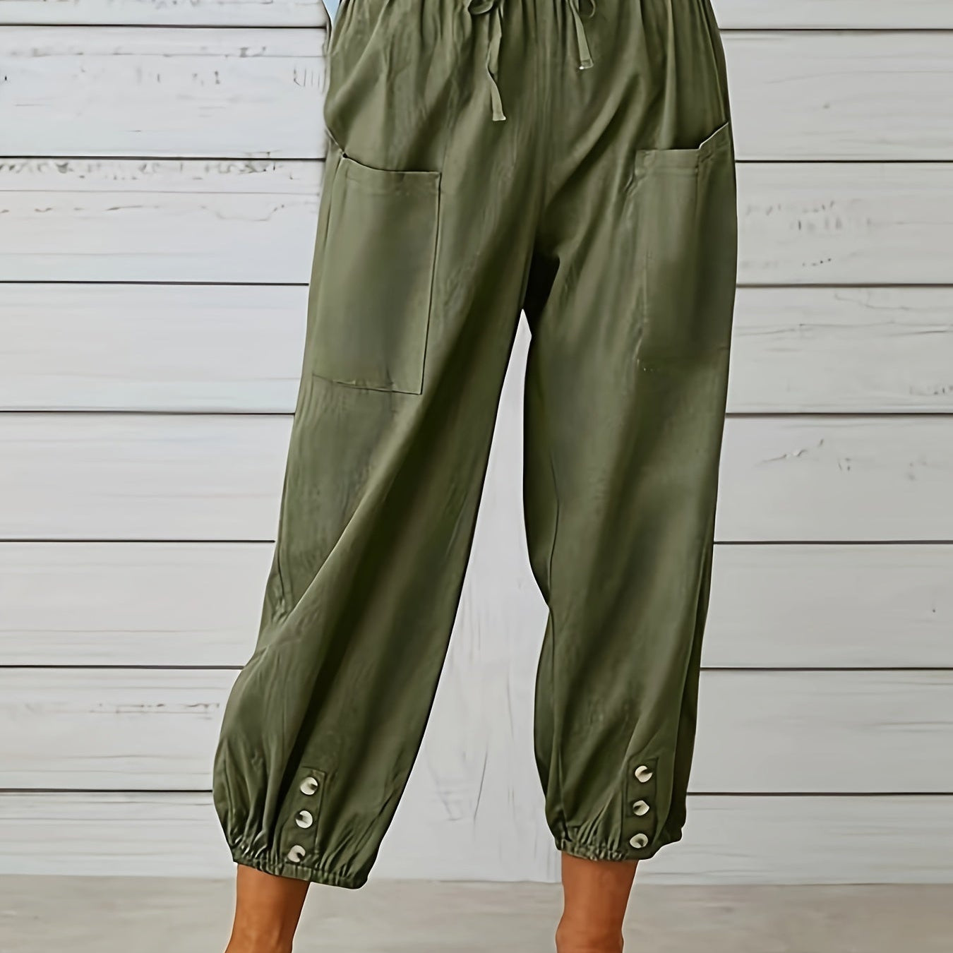 Women's Casual Trousers - Elastic Waist & Drawstring - Relaxed Fit - Buttoned Cuffs