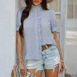 Women’s Blouse – Button-Up Front – Ruffle Trim – Puff Short Sleeve – Tailored Fit
