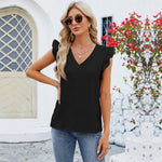 Couture-Moda's Women’s Short Sleeve Blouse – Relaxed Fit – V-Neck – Ruffled Sleeves – Breathable Blend offers effortless style. This lightweight blouse features a flattering V-neck, charming ruffled sleeves, and a relaxed fit for ultimate comfort. Perfect for casual days or dressing up for a night out!