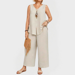 Alex renders a relaxed yet sophisticated silhouette by pairing minimalist lines with a contemporary sensibility that transitions from city mornings to resort evenings. The sleeveless top features a discreet front opening, while the wide-leg trousers promise ease without sacrificing polish. Meticulous craftsmanship and premium fabrics underpin every seam, reflecting a lineage of refined tailoring refined by years of atelier practice. Limited in availability, this ensemble offers enduring value and the quiet prestige of a timeless wardrobe cornerstone.