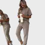 Alex Morgan Reed’s Two Tone Cotton Everyday Ensemble offers quiet luxury through precise craft and restrained elegance. A soft grey, two-tone set comprising a short-sleeve top and elasticated trousers, it delivers effortless style for daily wear. The minimalist silhouette speaks to timeless taste, while meticulous stitching and refined finishing reflect a commitment to quality. Produced in small batches with conscientious sourcing, this ensemble carries provenance and a sense of lasting value.