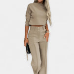 A modern set that exudes femininity and refined ease, embodying a quiet craft that elevates everyday moments. This pairing marries timeless style with practical detail, ideal for summer strolls, evenings with friends, or relaxed, polished appearances. The crop top hugs the body and flatters the décolletage, while airy trousers move with ease and grace. The lightweight fabric breathes, ensuring comfort across warm days and cooler evenings, while the line and finish reflect considered craftsmanship.