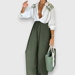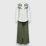 The Rowan Hampshire-Birkenhall Two-Tone Style Ensemble Set unites a refined blouse, featuring a delicate floral motif, with a flowing wide-leg pant designed for modern elegance with a nod to archival silhouette. The lightweight fabric drapes softly, while the high collar frames the neckline with a disciplined poise. The pairing, easy to dress up or down, reflects a considered approach to luxury: deliberate cut, restrained ornament, and a palette that travels across seasons. Limited availability reinforces its status as a collectible piece, prized by connoisseurs who value craftsmanship, provenance, and enduring value in timeless wardrobe essentials.