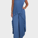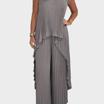 Refresh your wardrobe with this grey pleated ensemble, featuring a contemporary asymmetric top and wide-leg trousers, that unites fluid movement, measured comfort, and discreet refinement. Ideal for formal occasions yet refined enough for everyday luxury, the pleated fabric runs through the entire silhouette, creating kinetic lines with every step. The asymmetric top introduces a contemporary edge while preserving timeless elegance, making this piece a considered addition to a collector's wardrobe.
