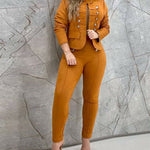 Slim Fit Double-Breasted Blazer and Pants Suit Set by Couture-Moda offers a sophisticated, tailored silhouette. This women’s suit set features a double-breasted blazer and slim-fit pants with structured seams for a polished look. Perfect for professional settings or chic evening events, it’s a versatile addition to your wardrobe.